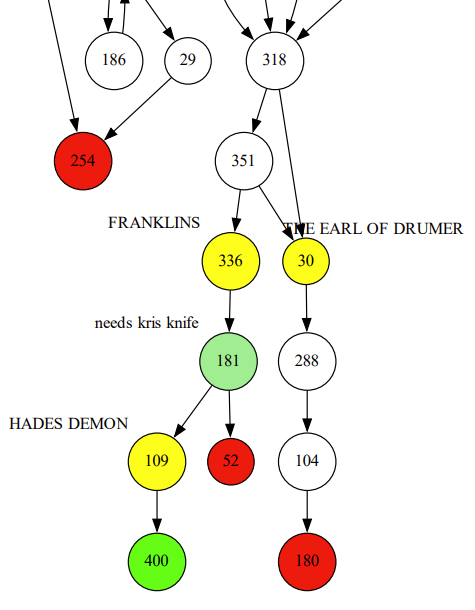 Tl;dr: The idea here is to use directed graphs to provide optimal walkthroughs of Fighting Fantasy gamebooks; in this case, House of Hell. Check out the beginning of the Deathtrap Dungeon post for tips on how to read the graph.